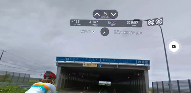 途中でVZfitの表示に気づきます。右下の距離表示で、ここをクリックすると進捗%や進行距離に加えてゴールまでの残りの距離が出ることに気づきました。